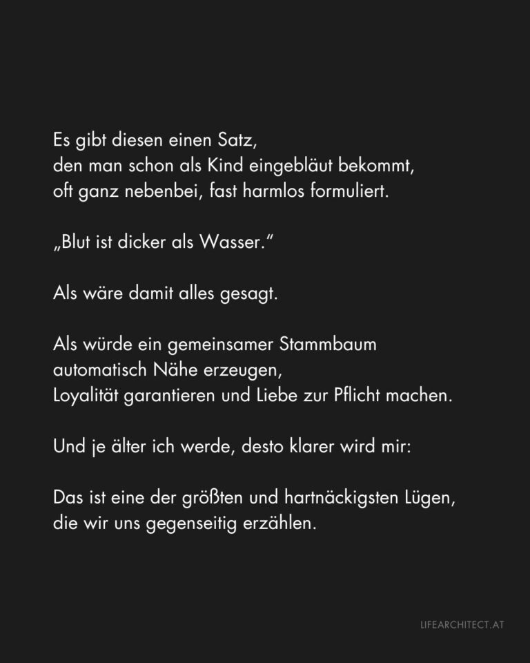 Das ist für viele schwer auszuhalten, weil es Verantwortung bedeutet. Wenn Familie keine Frage der Herkunft ist, sondern der Haltung, dann kann man sich nicht mehr hinter Tradition, Schuld oder Erwartung verstecken. Dann zählen nur noch Taten. Und Verhalten lügt nicht.