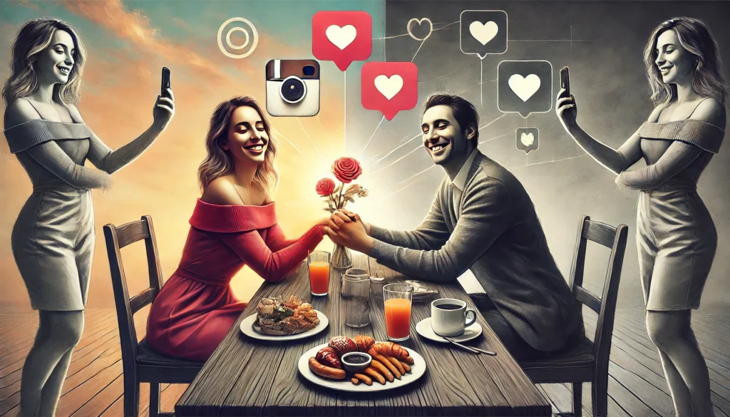 Die Beziehung als Fassade. Es geht nicht darum, sich auf jemand anderen einzulassen, sondern darum, dass die Welt von außen sieht, wie „glücklich“ man ist. Likes und Kommentare sind wichtiger als echte Verbindung. Die harte Arbeit, die es braucht, um eine Beziehung aufzubauen und zu pflegen, wird dabei umgangen. Es ist die Oberfläche, die zählt – die Illusion von Glück, nicht das Glück selbst.