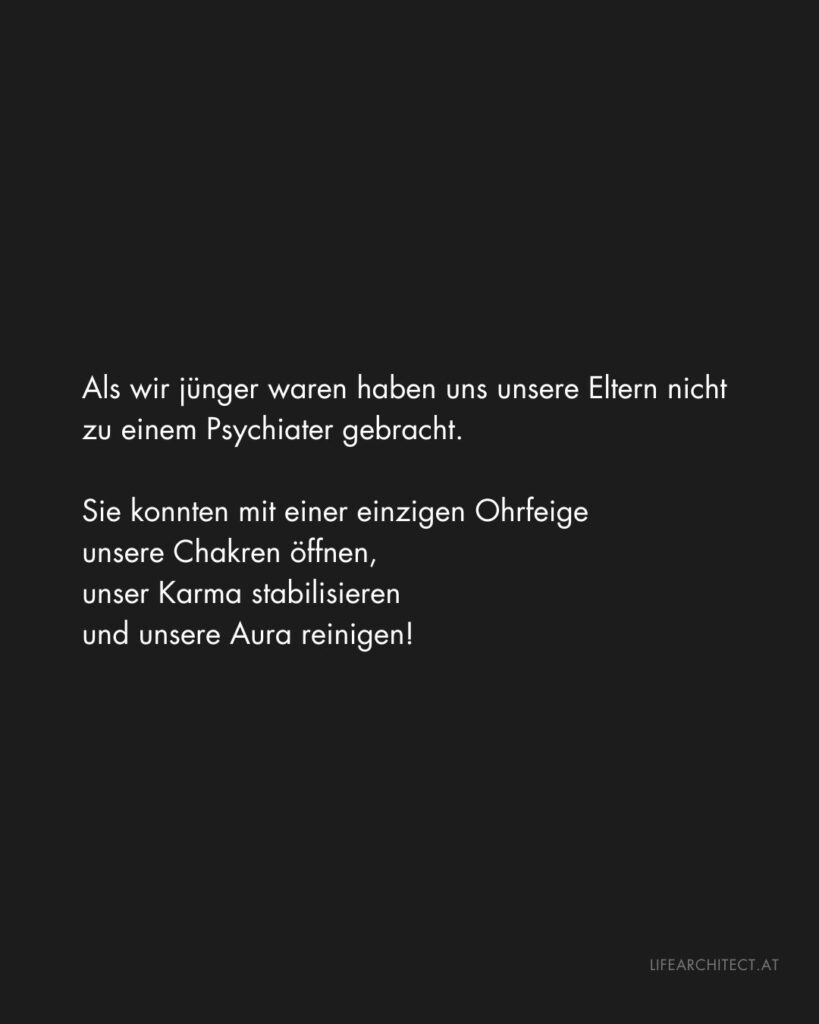 Ich hab diesen Spruch gelesen: „Früher hat man uns nicht zum Psychiater gebracht. Eine Ohrfeige hat gereicht, um die Chakren